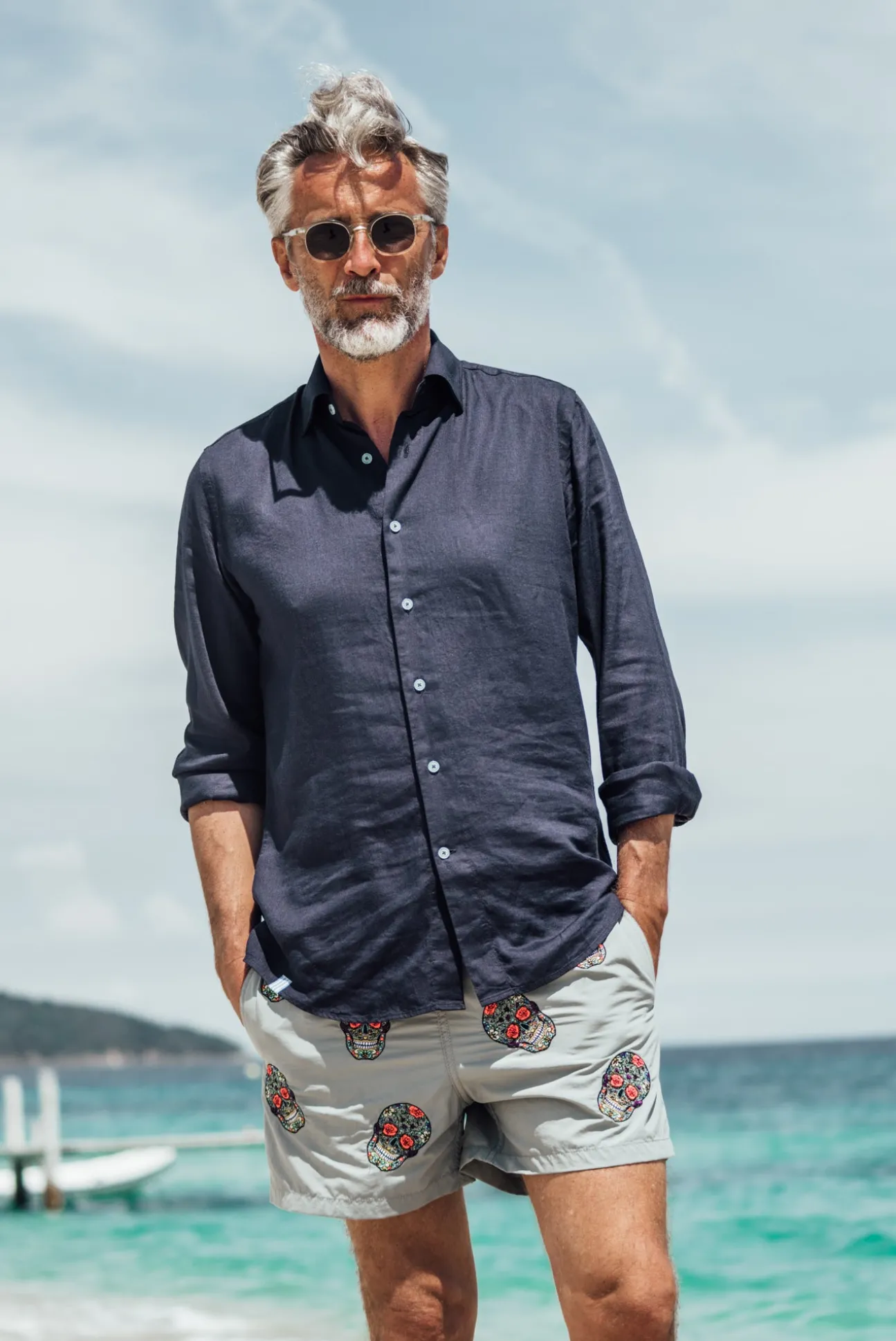 Men swimwear with Mexican heads embroideries all over the piece.