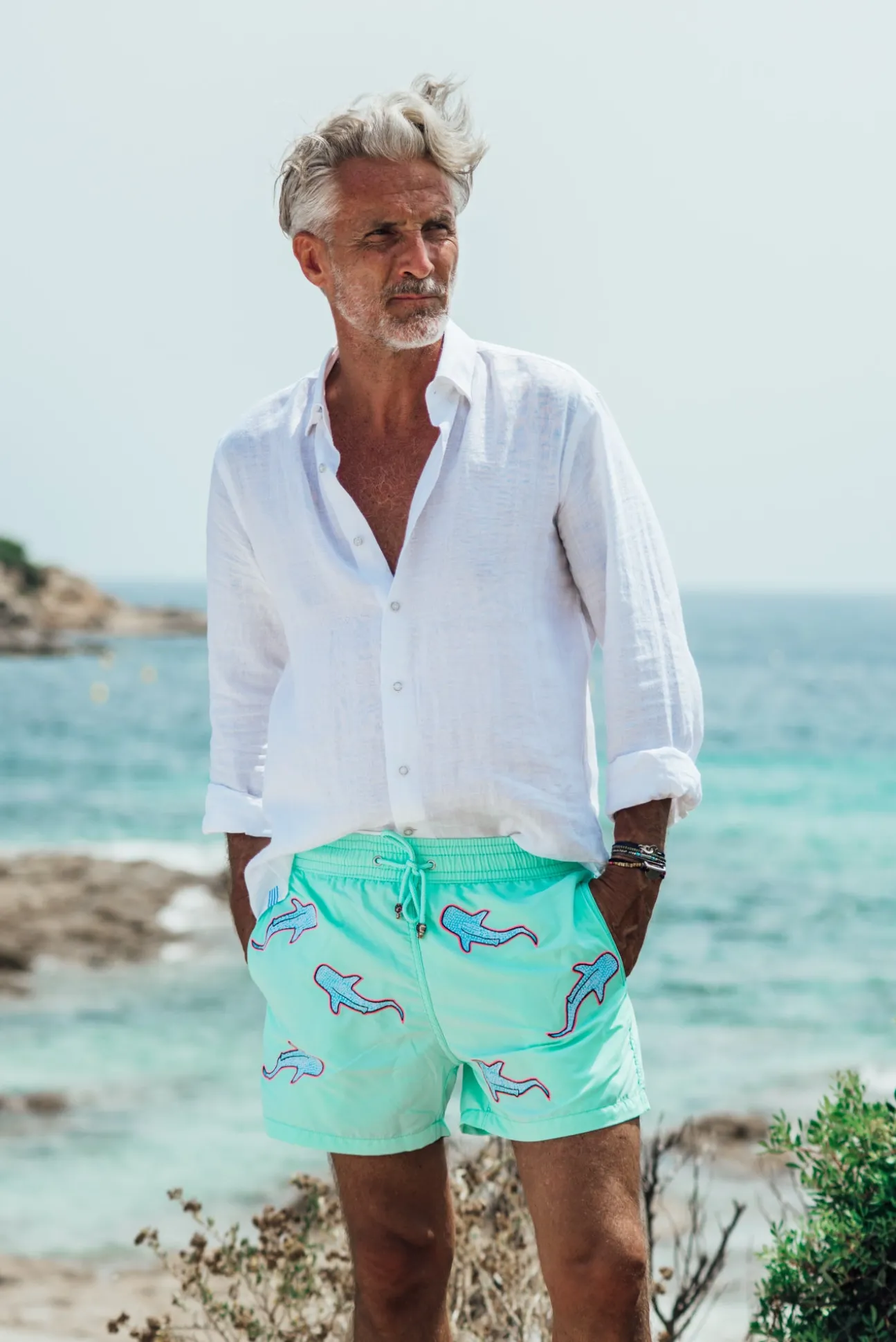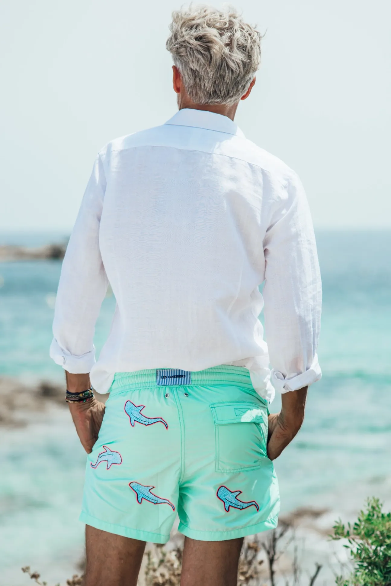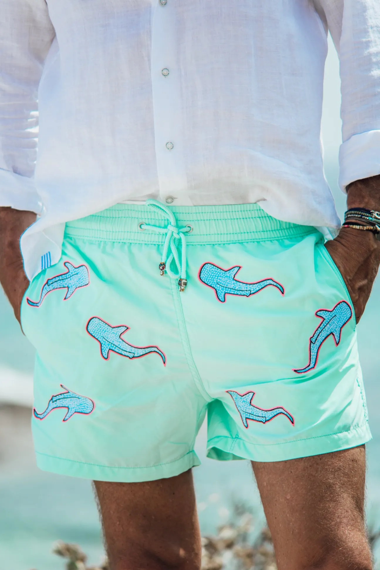 Men swimwear with shark embroideries all over the piece.